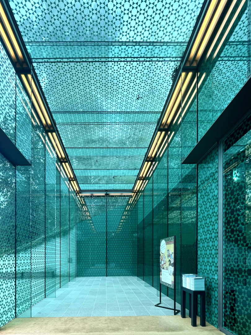 The architecture that forms the Museum Rietberg combines historical residences with a functional modern building. Among its architectural features, the glass pavilion “Emerald” stands out. The emerald-green glass façade is the crown of the underground extension, which expands exhibition space across two underground levels while preserving the historical landscape.