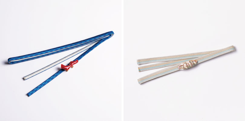 帯留に合わせて二分紐、三分紐も仕立てました。赤珊瑚には土佐の海をイメージした青×銀の両面使いの「大和組」、あわびには貝殻の複雑な干渉色を写し取った「ちりめん組」を合わせています。